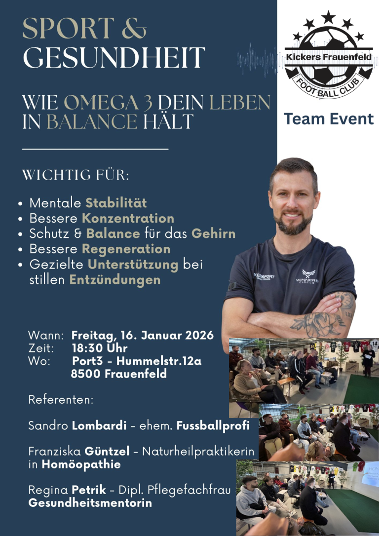 Die Kickers Frauenfeld bedanken sich herzlich beim gesamten Referenten-Team für den spannenden und lehrreichen Vortrag sowie bei Sandro Lombardi für die hervorragende Moderation und Gastfreundschaft. Ein gelungener Anlass, der nachhaltige Impulse für Gesundheit und Leistungsfähigkeit gesetzt hat.
